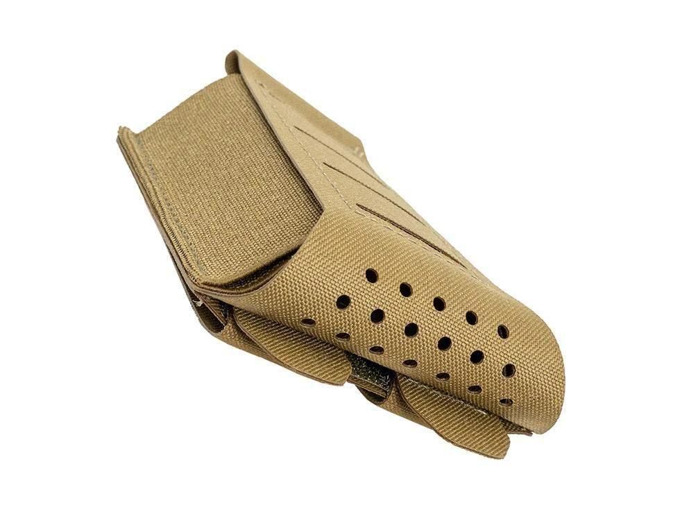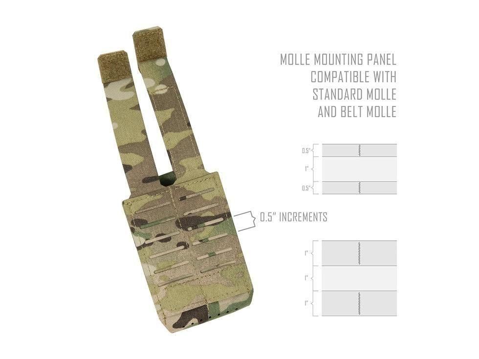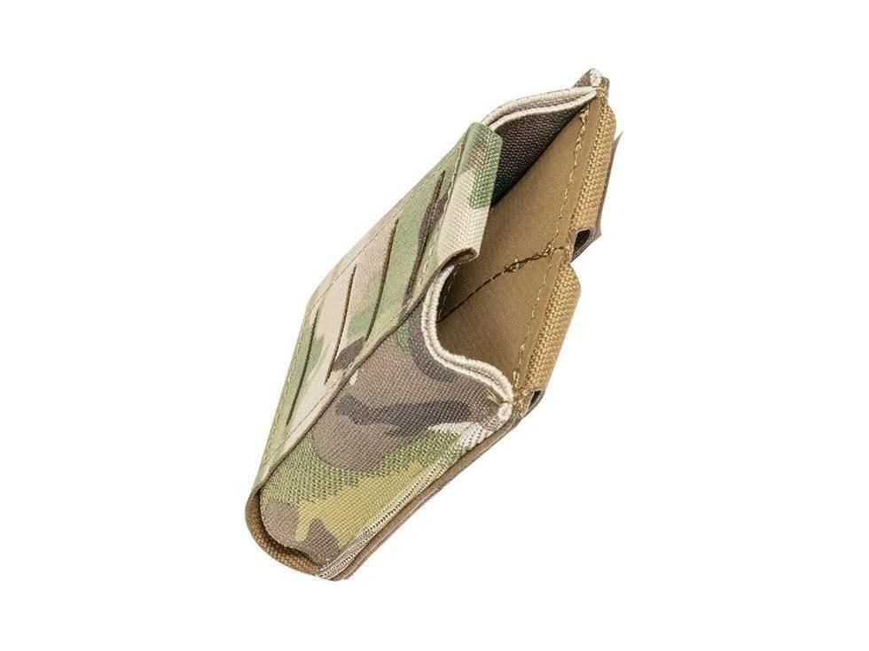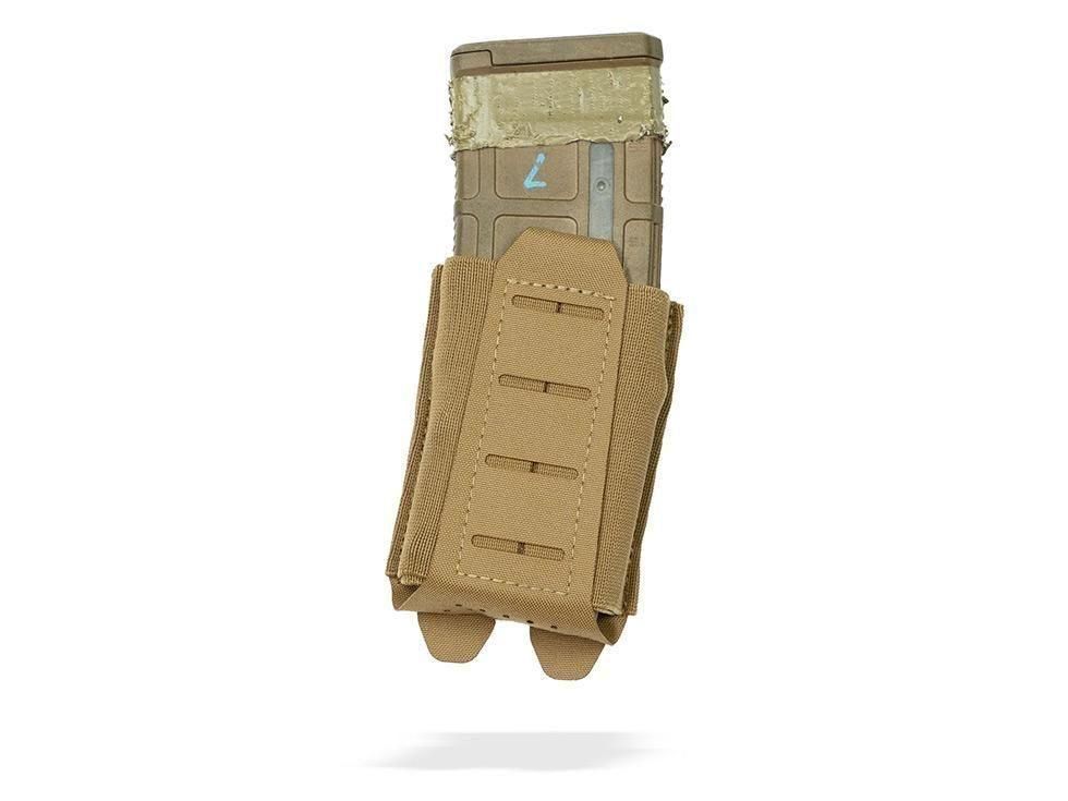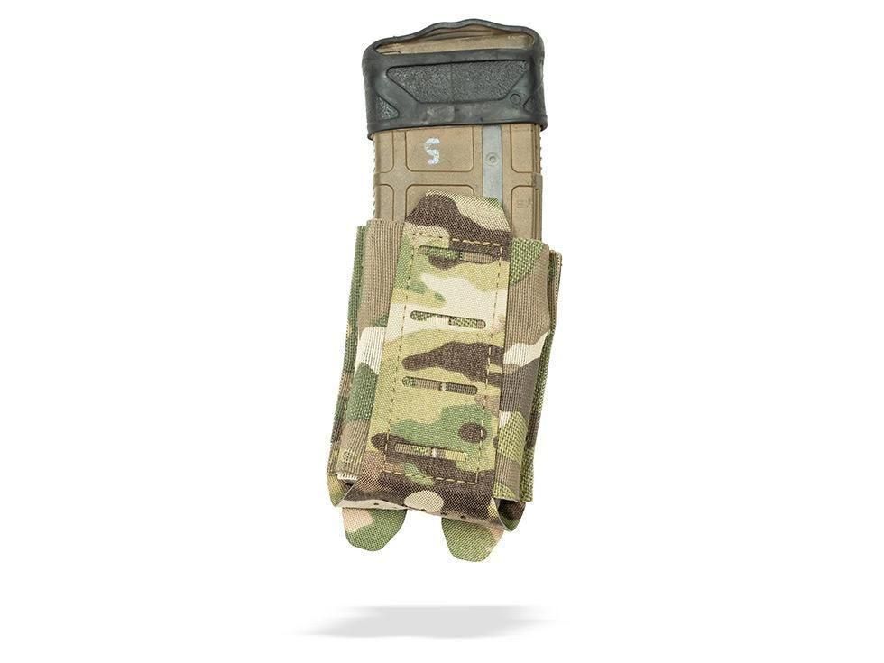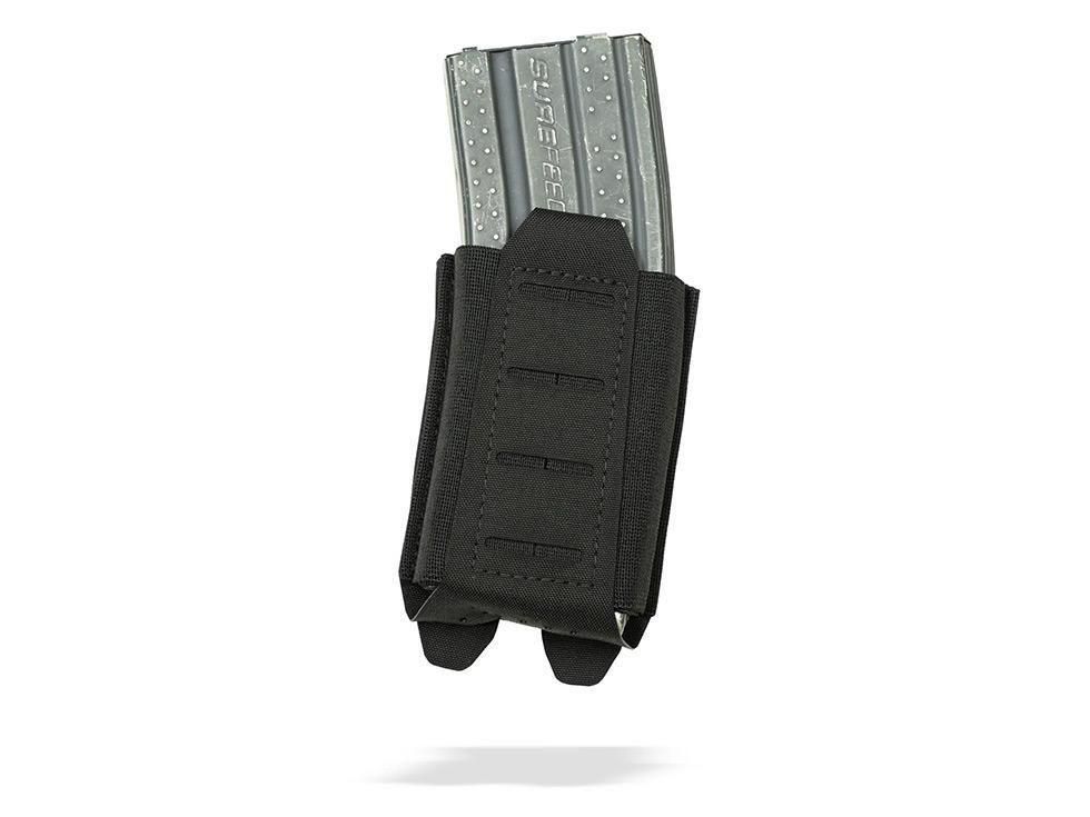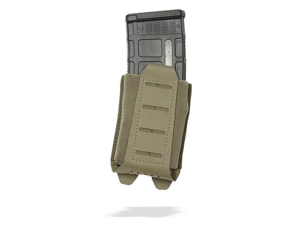 MOLLEベースのプレートキャリアやベルトシステム、チェストリグに幅広く対応。普段は薄く、装填時には強固に保持できる汎用性の高いライフルポーチです。